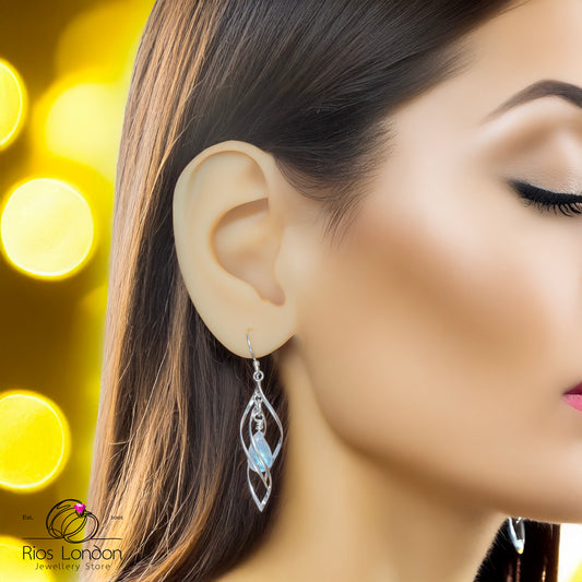 Sterling Silver Natural Moonstone Dangle Twisted Spiral Cage Earrings Boxed