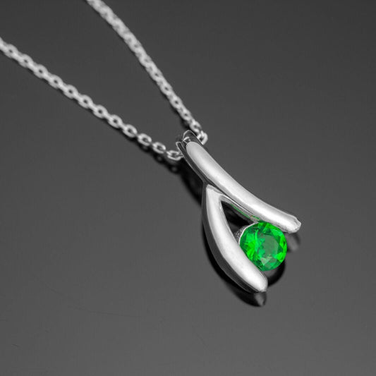 925 Sterling Silver Emerald Ribbon Design Necklace Lab-Created Gemstone Boxed