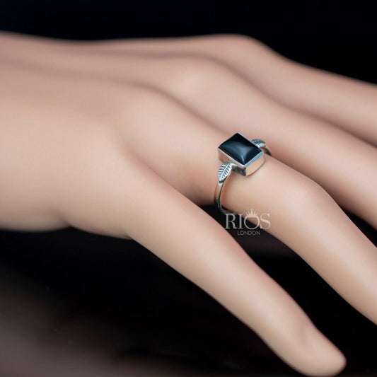 925 Sterling Silver Cabochon Natural Onyx Black Cushion Gemstone Ring Gift Boxed