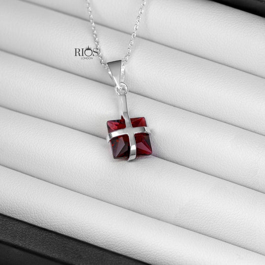 925 Sterling Silver Garnet Ribbon Design Necklace Lab-Created Gemstone Boxed