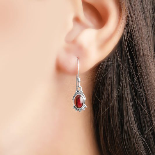 925 Sterling Silver Oval Natural Garnet Dangle Drop Earrings Studs Gift Boxed
