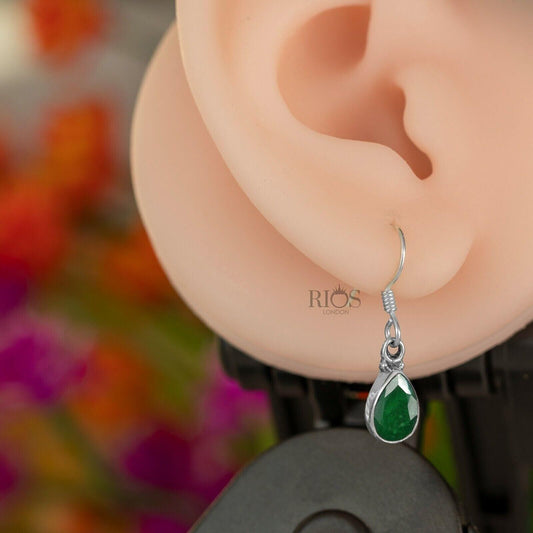 925 Sterling Silver Emerald Earrings Dangle Hook Ear Green Teardrop Gift Boxed
