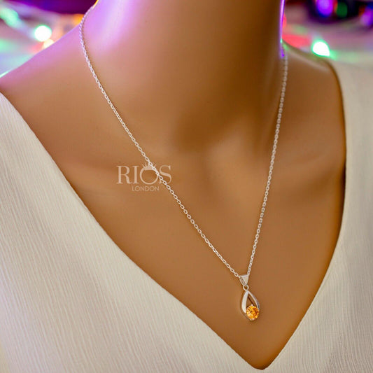 925 Sterling Silver Citrine Orange Lab-Created Gemstone Necklace Gift Boxed