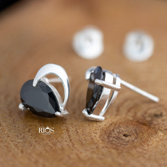 925 Sterling Silver Love Heart Black Lab-Created Onyx Earrings Studs Gift Boxed