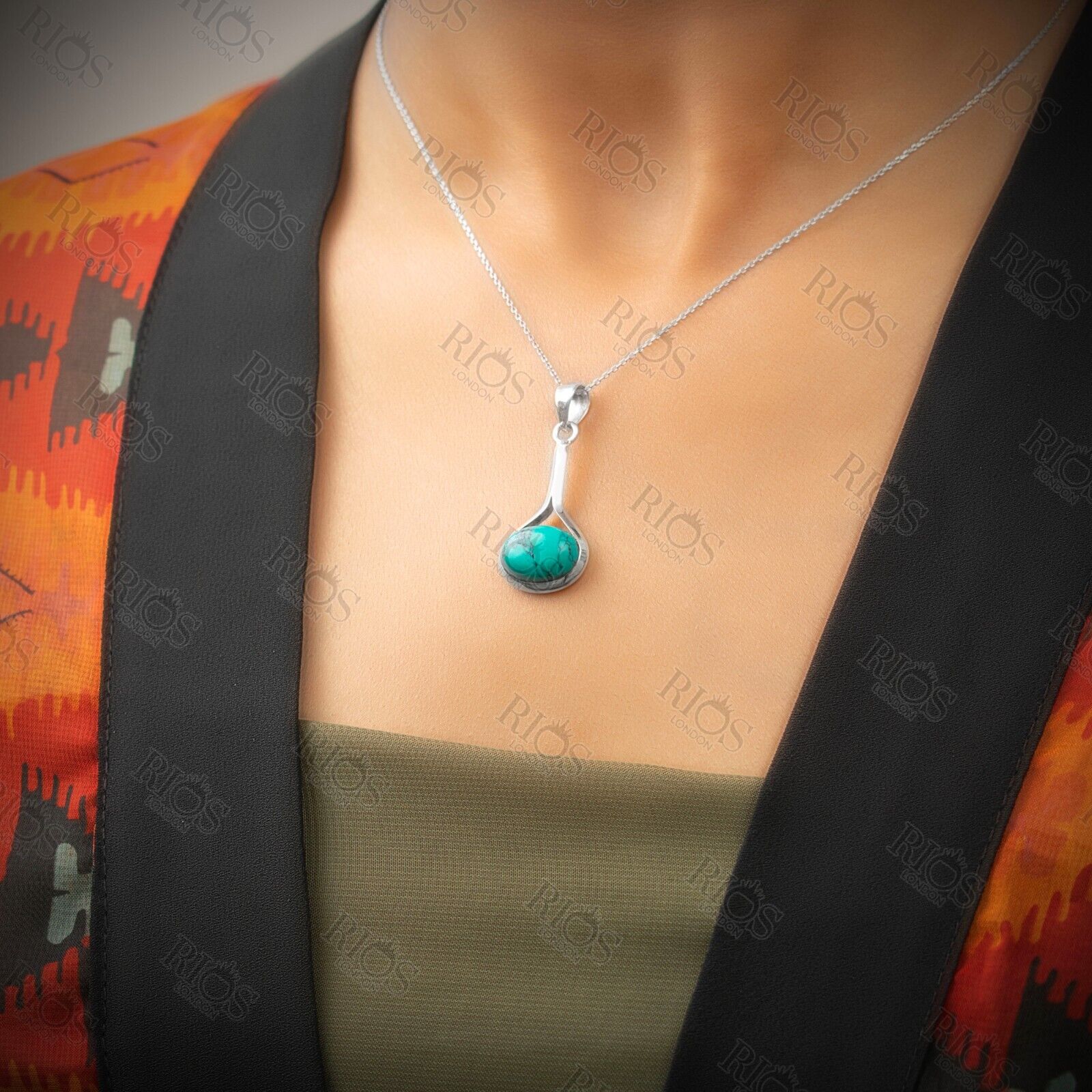 Beautiful sterling silver brand new Rios London oval pendant necklace with a turquoise.